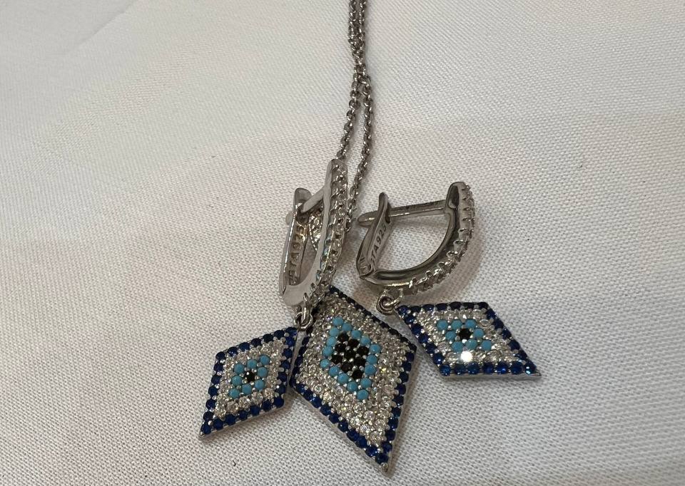 این نیمست چشمنظر با ترکیب نقره ۹۲۵ و نگینهای برلیان اتمی آبی، جلوهای درخشان و معنای محافظتی دارد. آبکاری رودیوم مقاومت در برابر تیرگی را افزایش میدهد و گوشوارههای کلیپسی استفادهای راحت و ایمن فراهم میکنند. مناسب استایل روزمره و مجالس.